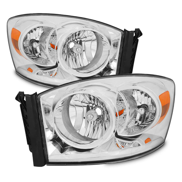 AKKON - Fits 2007-2008 Dodge Ram 1500 2007-2009 Ram 2500 / 3500 Chrome Headlights + LED Halo Projector Clear Fog Lamp Pair