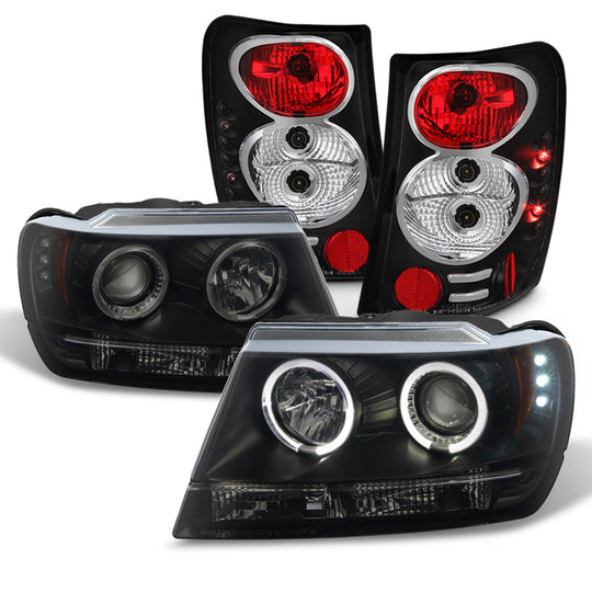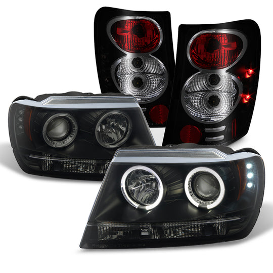 AKKON - For Jeep Grand Cherokee Black Smoke Dual Halo Ring Projector LED Replacement Headlights + Tail lamp