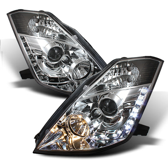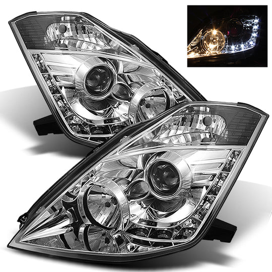 AKKON - For Nissan 350Z Fairlady Z33 Chrome Clear DRL Daylight LED Strip Halogen Type Projector Headlights Pair