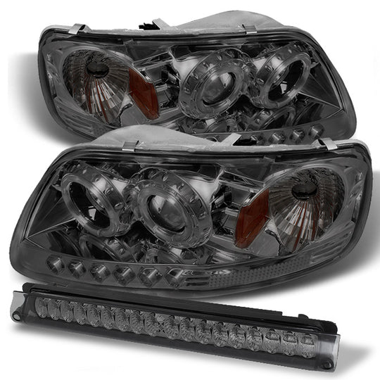 AKKON - For Smoked Ford F150 250 Dual Halo Projector LED Headlights + LED 3Rd Brake Lamp Set