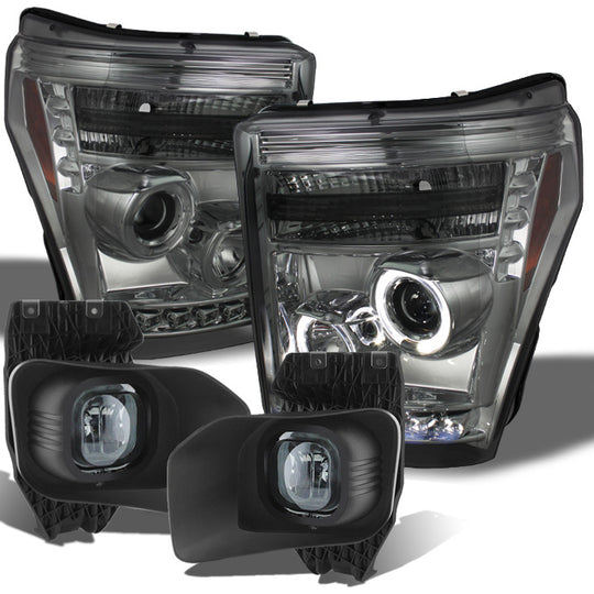 AKKON - For Smoked Ford 11-16 F250 F350 F450 F550 Super duty Dual Halo Projector LED Headlights+ Fog Light