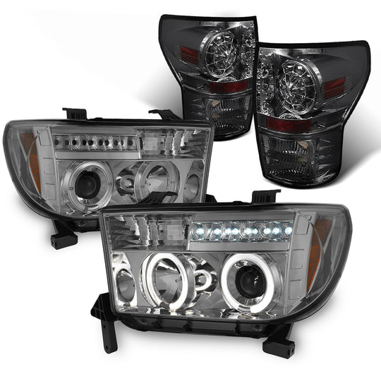 AKKON - For Toyota Tundra Smoke Dual Halo Ring Projector LED Replacement Headlights + Black Smoke LED Tail Lamps