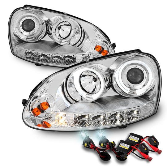 AKKON - For VW Rabbit GTI Jetta R32 Chrome Clear Halo DRL LED Strip Halogen Type Projector Headlights + 6K HID