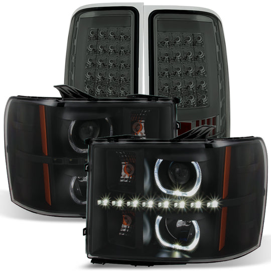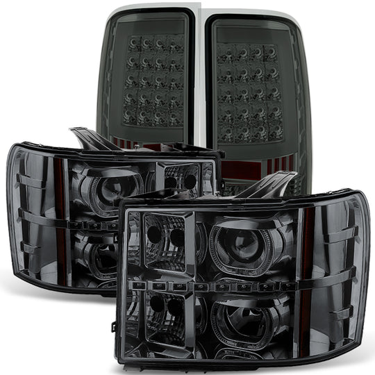 AKKON - For [Dual LED Halo Ring] 07-13 Sierra Pickup Truck Smoked Projector Headlights + LED Tail light Combo