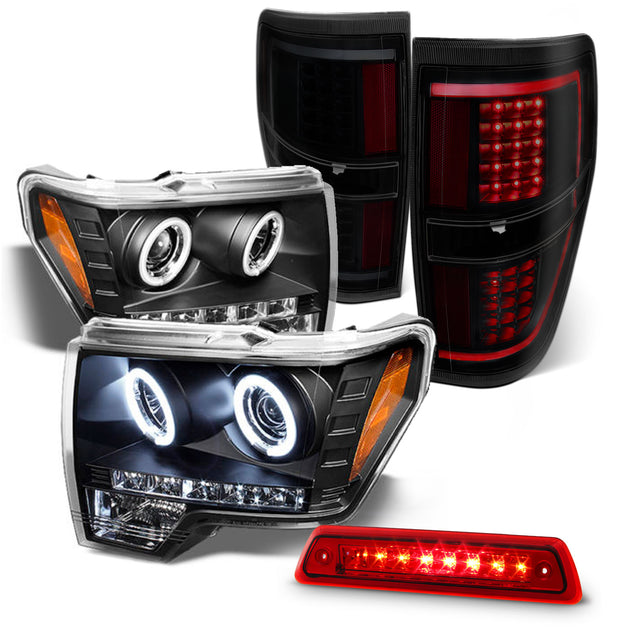 AKKON - Fits 2009-2014 F-150 F150 CCFL Halo Smoked Projector Headlight+ Black Smoke [Light Bar] LED Tail Lamp + 3rd Brake Light