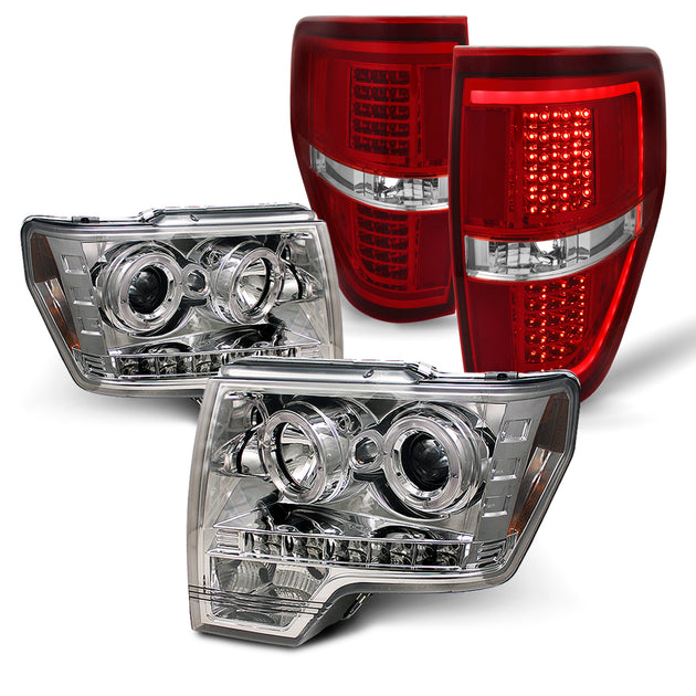 AKKON - Fits 2009-2014 F-150 F150 Dual Halo LED Projector Chrome Headlights + LED [C-Light Bar] Red Clear Tail Lamp Combo