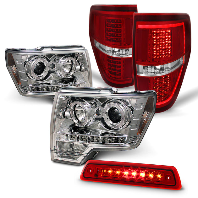 AKKON - Fits 2009-2014 F150 Dual Halo Projector Clear Headlights + LED [C-Light Bar] Red Tail Lamp + Red Led 3rd Brake Lamp