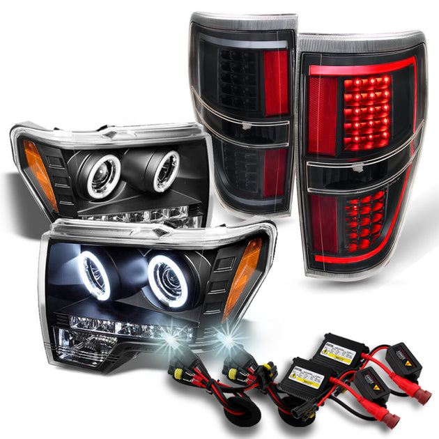 AKKON - Fits 2009-2014 F150 CCFL Halo Projector Black Headlights + LED [C-Light Bar] Tail Lamp + 6000K HID Slim Xenon Kit Combo