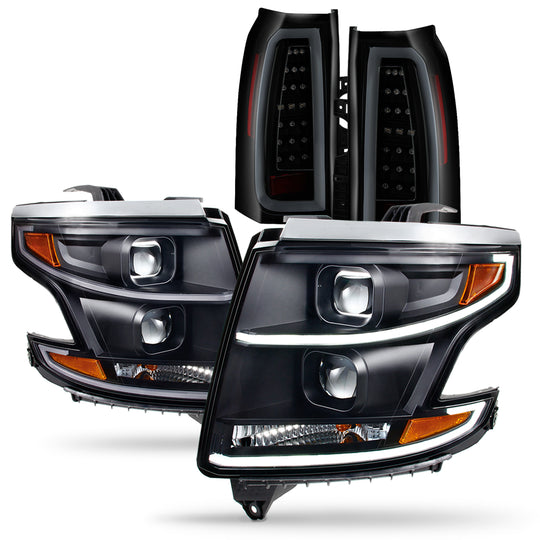 Regular price $594.99This is a 100% brand new pair of Headlights Replacement Assemblies in Midnight Black Housing With Crystal Clear Lens + Tail light in Midnight Black Housing With Smoked Lens Compatible With: 2015-2020 Chevy Suburban Tahoe Halogen... -