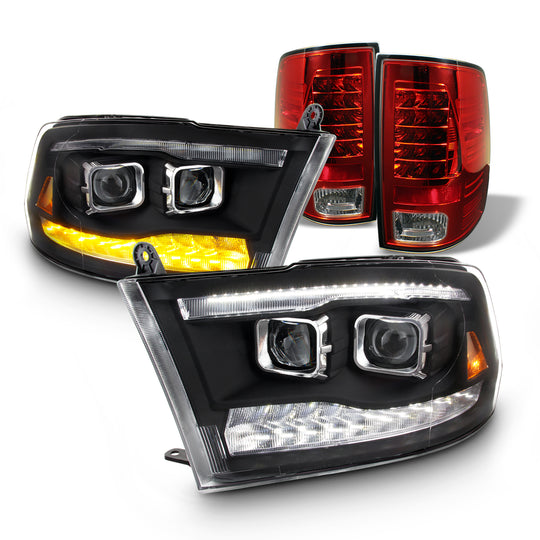 AKKON - [Housing+ Bulbs] Fit 09-18 Dodge Ram Dual Projector & DRL Headlights + Red LED Tail Lights