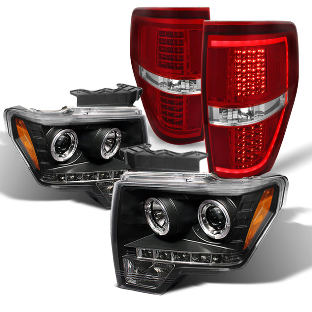AKKON - Fits 2009-2014 Ford F150 F-150 Dual Halo LED Projector Black Headlights + LED [Light Bar] Red Tail Lamp LH+RH Combo