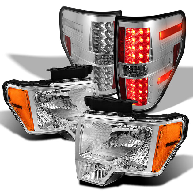 AKKON - Fits 2009-2014 Ford F150 Truck Chrome Headlights + LED Clear Tail Brake Lamp Pair Left Driver+Right Passenger