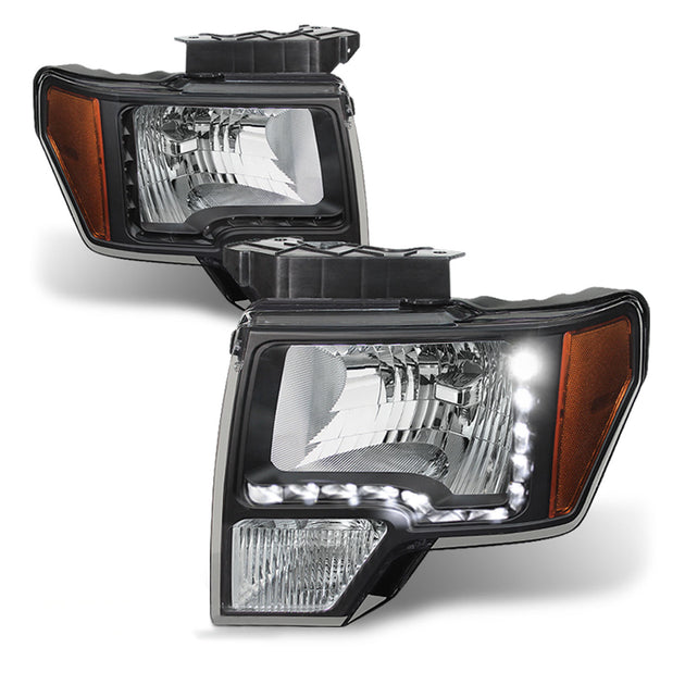 AKKON - Fits 2009-2014 Ford F150 [Halogen Type] Projector Black Headlights Pair w/ LED Tube DRL Parking Turn Signal