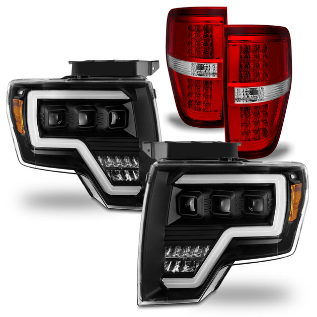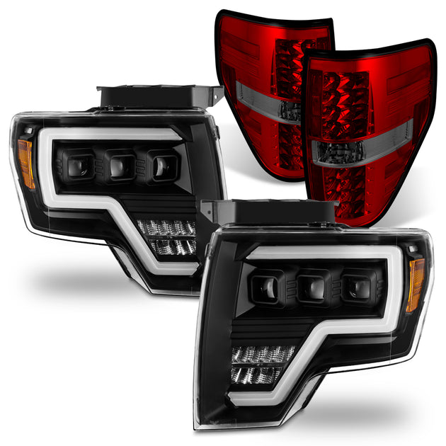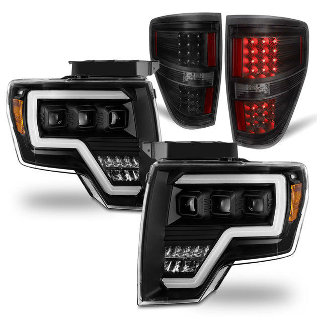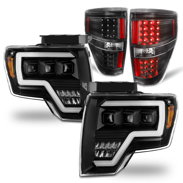 AKKON - Fits 2009-2014 Ford F150 Pickup Truck [Full LED] Projector Hi/Lo Beam Black Headlights + LED Tail Brake Light Pair Combo