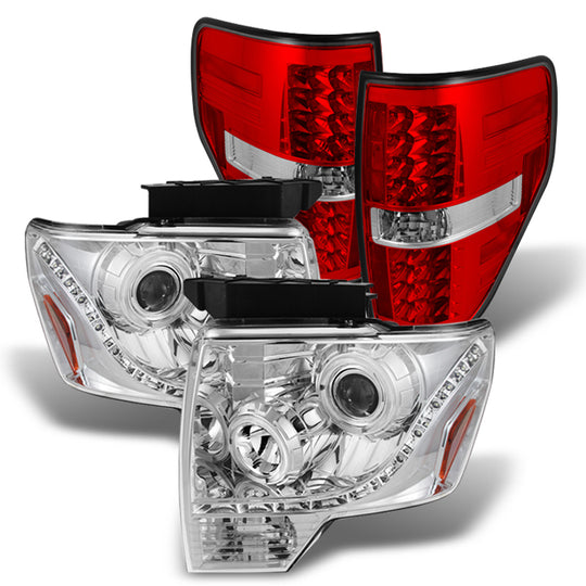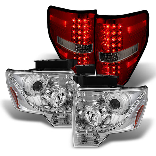 Fits 09-14 F-150 DRL Halo Chrome Projector Headlights+Red Smoked LED Tail Lights