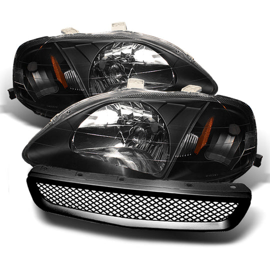 Fits 99-00 Honda Civic Amber Black Headlights Lamps +JDM Sport Sport Mesh Grille