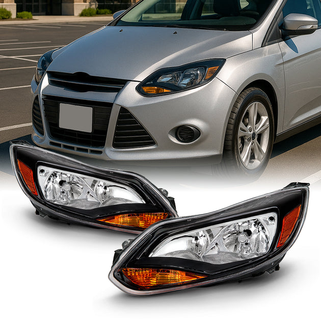 AKKON - Fits 2012-2014 Ford Focus 4Door Sedan Hatchback [Halogen Type] Chrome Trim Headlights Pair Driver Left+Passenger Right