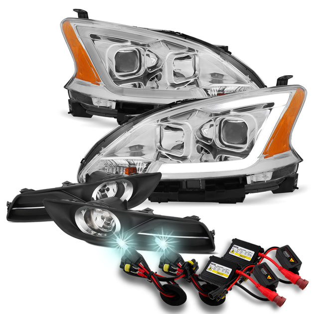 AKKON - Fits 2013 2014 2015 Sentra LED DRL Projector Front Chrome Clear Headlights Headlamps Pair + Fog Lamp + 6000K HID