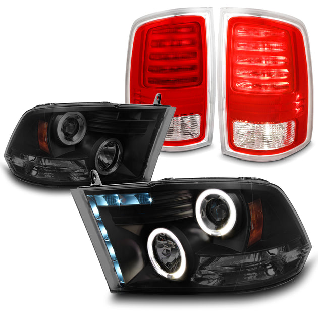 AKKON - Fits 2013-2018 Ram 1500 2500 3500 LED DRL Running Halo Projector Black Smoke Headlights+LED Red Tail Lamp w/Wire