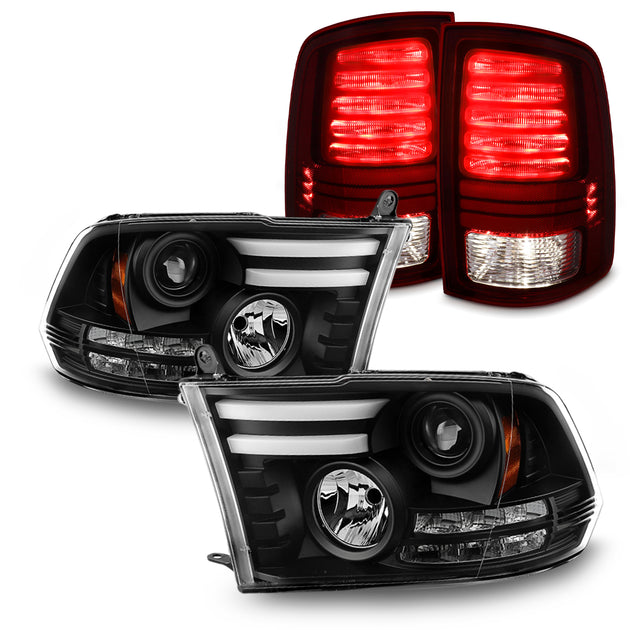 AKKON - Fits 2013-2018 Ram 1500 2500 3500 LED DRL Tube Signal Projector Black Headlights + LED Red Tail Lamp w/Wire Set
