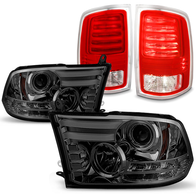 AKKON - Fits 2013-2018 Ram 1500 2500 3500 LED DRL Running Halo Projector Smoke Headlights + LED Red Tail Lamp w/Wire Set