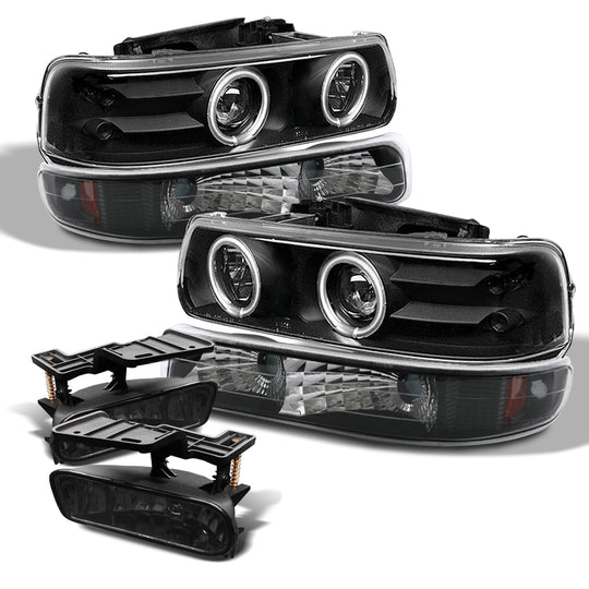 AKKON - Fits 1999-2002 Silverado 2000-2006 Suburban Tahoe Dual Halo Headlights + Bumper Lamps & Fog Lights -Black