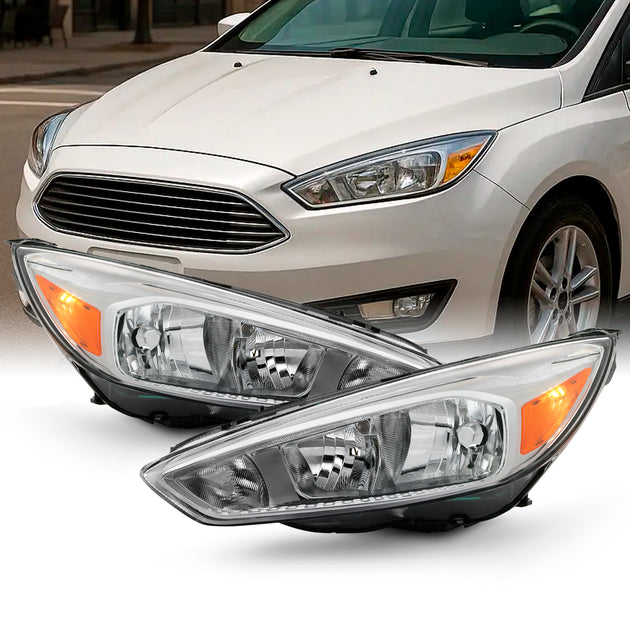 AKKON - Fits 2015-2018 Ford Focus S | SE | ST Chrome Bezel [Halogen Type] Headlight [w/o DRL LED Function] Pair Left + Right