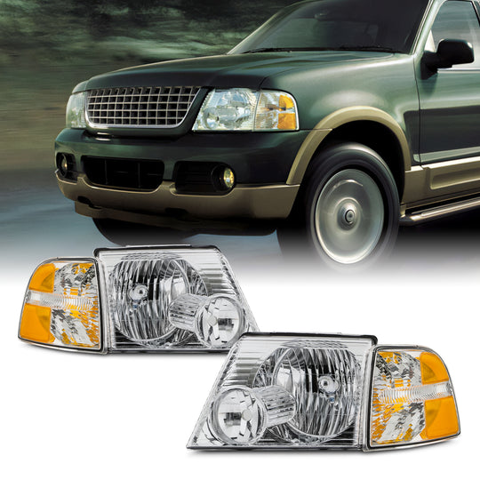 AKKON - Fits 2002-2005 Ford Explorer Halogen Chrome Headlights w/ Corner Signal Lamp Pair Driver+Passenger Replacement