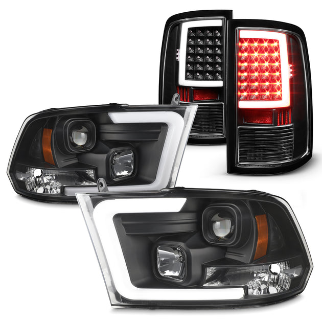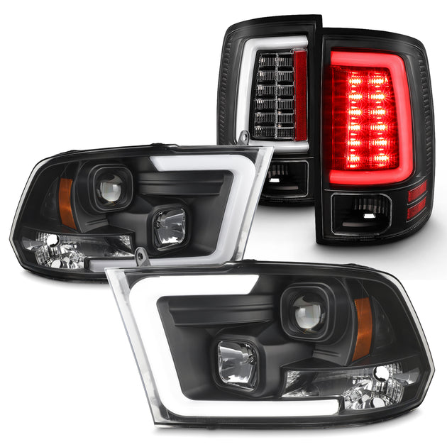 AKKON - Fit 2009-2019 Dodge Ram 1500 2500 3500 Halogen w/LED Sequential Projector Headlights + C-Shape LED Black Tail Lights