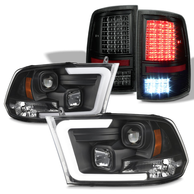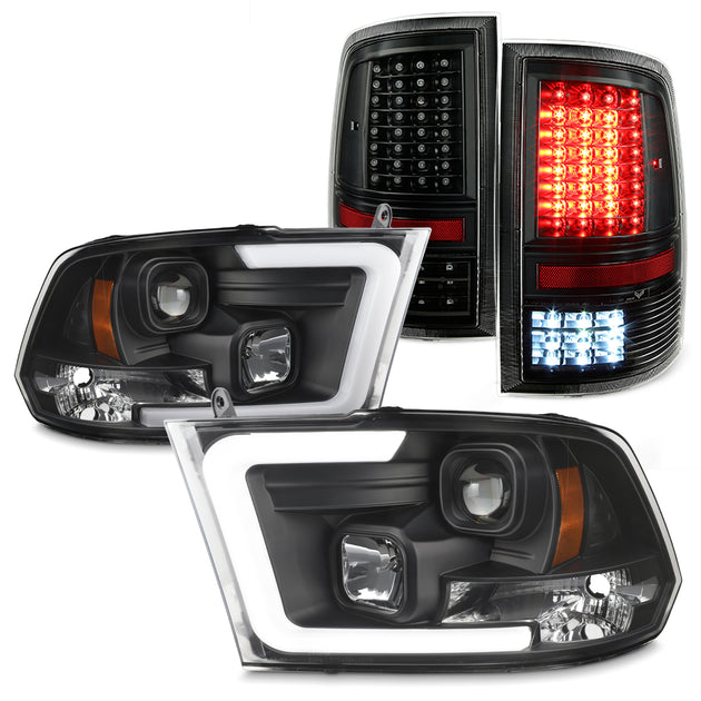 AKKON - Fit 2009-2019 Dodge Ram 1500 2500 3500 Halogen w/LED Sequential Projector Headlights + Black Smoked LED Tube Tail Lights