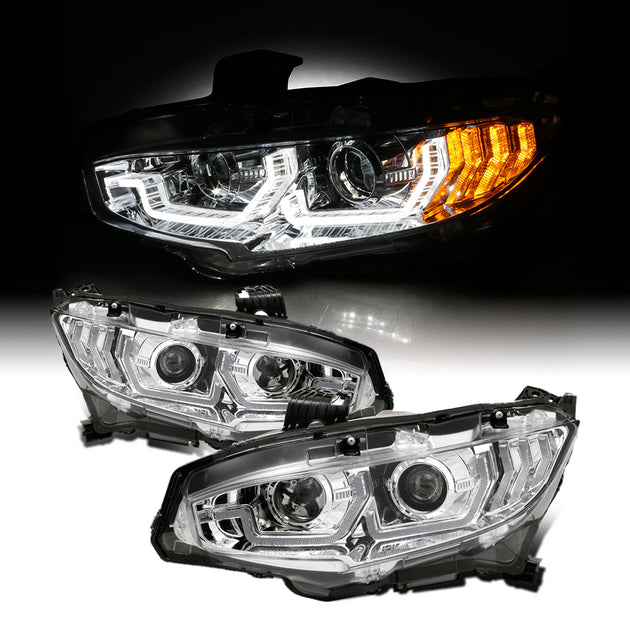 AKKON - Fits 2016-2021 Honda Civic Sedan [Tube Light Bar] Sequential Side Signal Projector Chrome Headlights Pair Left + Right