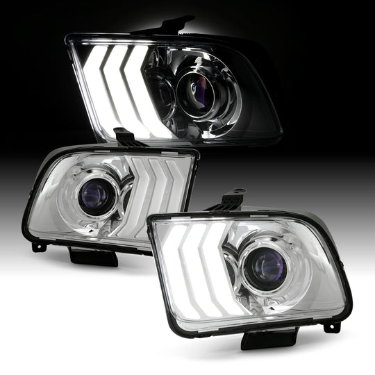 AKKON - Fits 2005-2009 Ford Mustang LED Tube DRL Parking [Halogen Type] Projector Chrome Headlights Pair Driver+Passenger