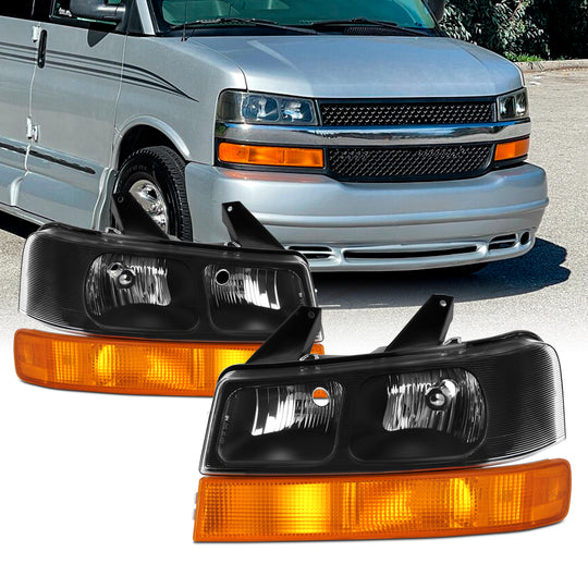 AKKON - Fit 2003-2022 Chevy Express | GMC Savana 1500 2500 3500 Black Headlights+Bumper Lights Combo Set Pair Left+Right