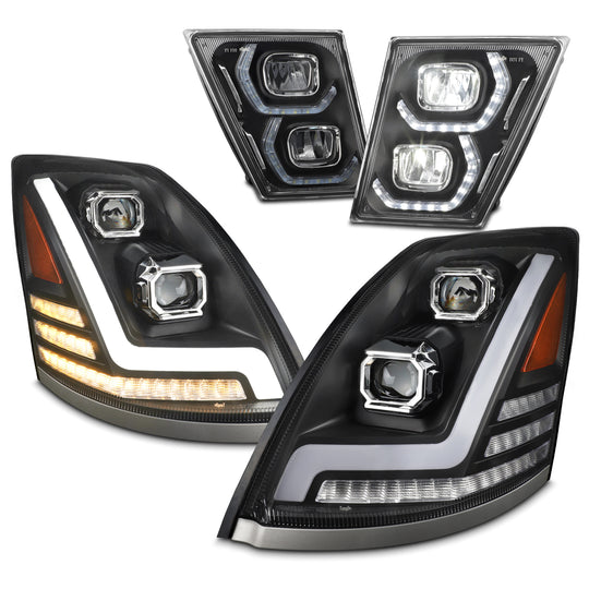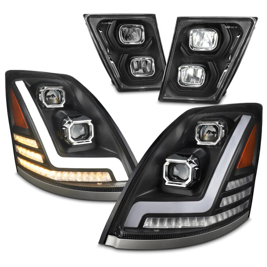 AKKON - Fit 2003-2017 Volvo VNL [Full LED DRL] w/Sequential Projector Headlights + Black LED Bumper Fog Lights Lamp Set