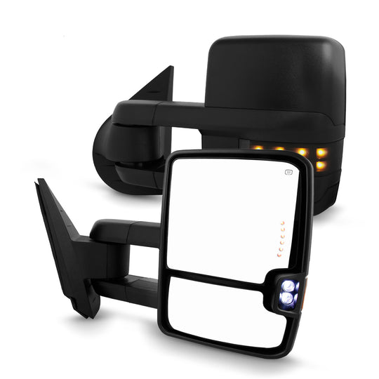 Regular price $199.99This is the Heavy Duty Towing Pair Mirror in Black Finished with Clear LED turn signal Compatible With: 2007-2013 Chevy Silverado 1500 2007-2014 Chevy Silverado 2500 HD/ 3500 HD 2007-2013 GMC Sierra 1500 2007-2014 GMC Sierra... -