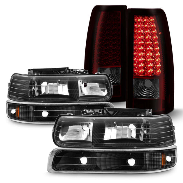 AKKON - Fits 94-98 C/K 1500 2500 3500 Tahoe Suburban Pickup Black Headlights + Corner + Bumper Signal Lamp + LED Tail Light Pair
