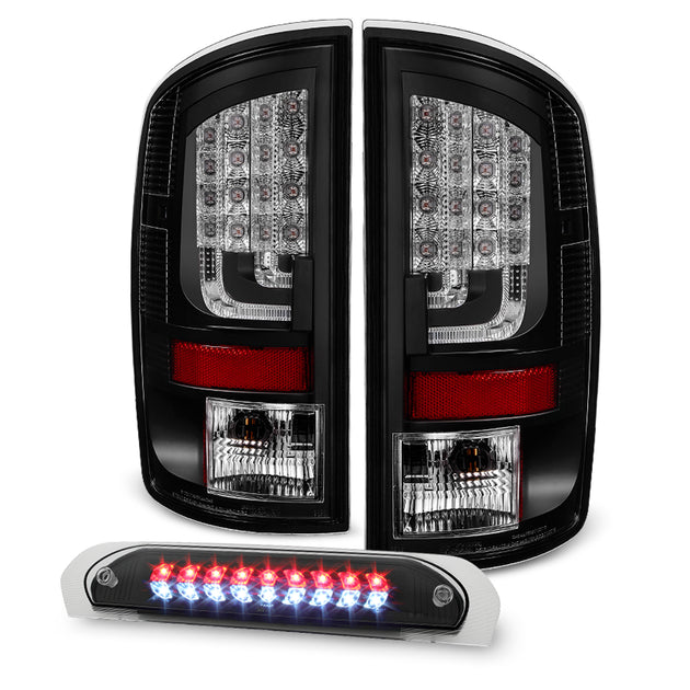 AKKON - For 02 03 04 05 06 Dodge Ram Black Bezel LED Tail Light + LED 3rd High Mount Cargo Brake Lamp Set