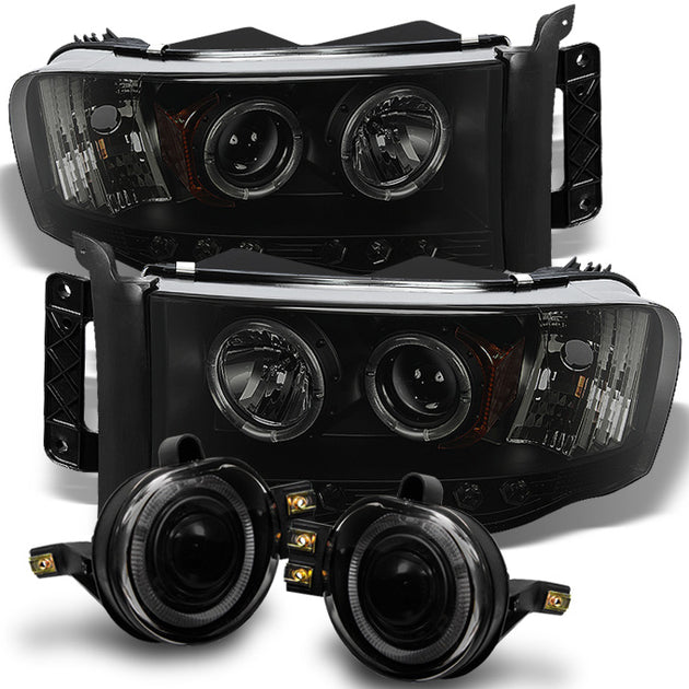 AKKON - For 02-05 Dodge Ram 1500 2500 3500 Black Smoked Halo Projector LED Headlights+ Smoke Fog Halo Ring Lamps