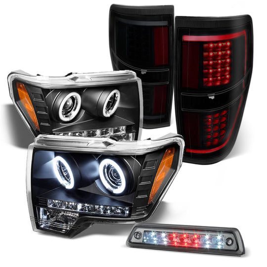 AKKON - Fits 2009-2014 F150 CCFL Halo Projector Black Headlights + Black Smoked LED [Light Bar] Tail Lamp + Red 3rd Brake Light