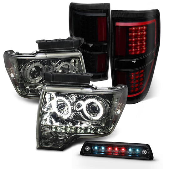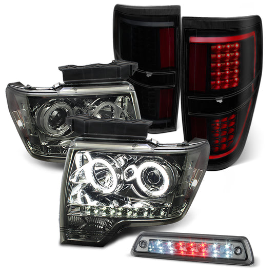 AKKON - Fits 2009-2014 F-150 F150 CCFL Halo Smoked Projector Headlight+ Black Smoke [Light Bar] LED Tail Lamp + 3rd Brake Light