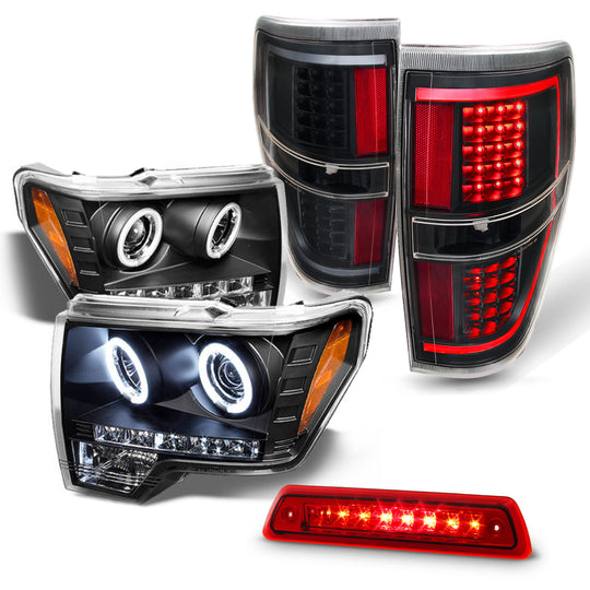 AKKON - Fits 2009-2014 Ford F150 CCFL Halo Projector Black Headlights + Black Smoked LED [Light Bar] TailLamp + 3rd Brake Light