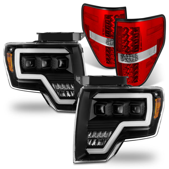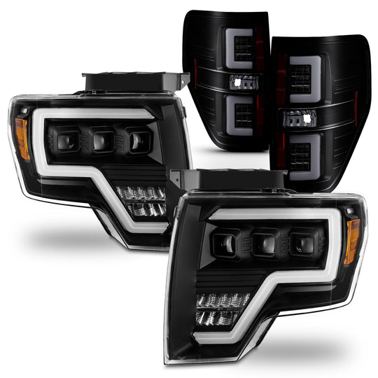 AKKON - Fits 2009-2014 Ford F150 Pickup Truck [Full LED] Projector Beam Black Headlights + LED Tube Bar Smoked Tail Brake Lights