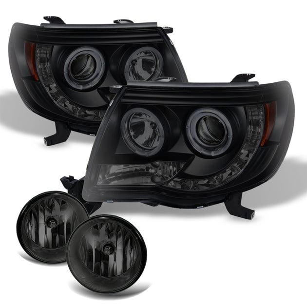 AKKON - For 05-11 Toyota Tacoma Pickup Black Smoke Dual Halo Ring Design Projector LED Replacement Headlights Lamps + Fog Lights