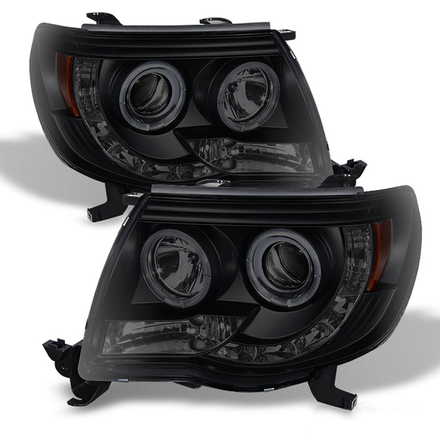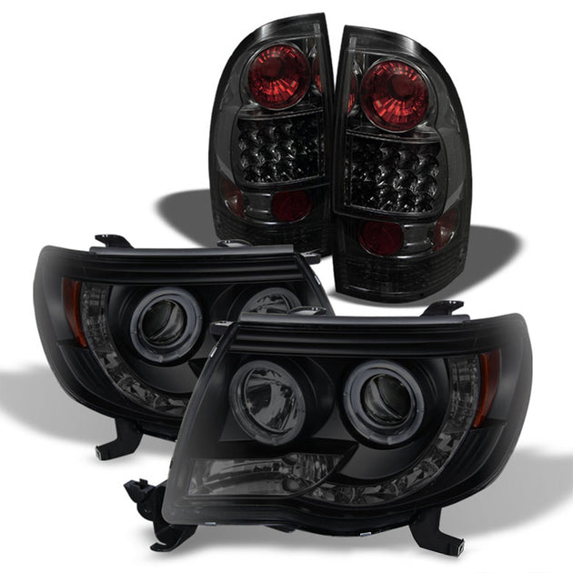 AKKON - For 05-11 Toyota Tacoma Pickup Black Smoke Dual Halo Ring Design Projector LED Replacement Headlights Lamps + LED Tail Light