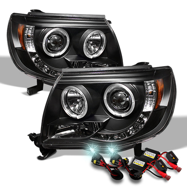 AKKON - For 05-11 Toyota Tacoma Black Bezel Dual Halo Ring Design Projector LED Replacement Headlights + 6000K HID Kit