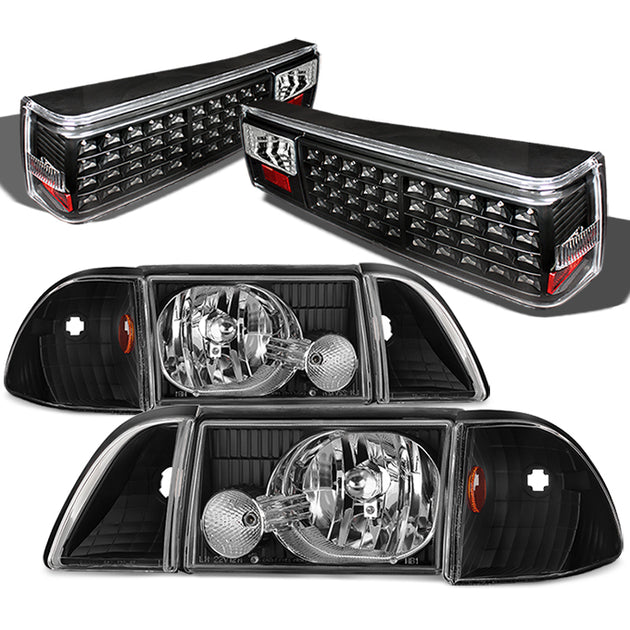 AKKON - For 1987-1993 Ford Mustang Black Headlights w/ Corner & Signal Lights + LED Taillights Complete Set Pair