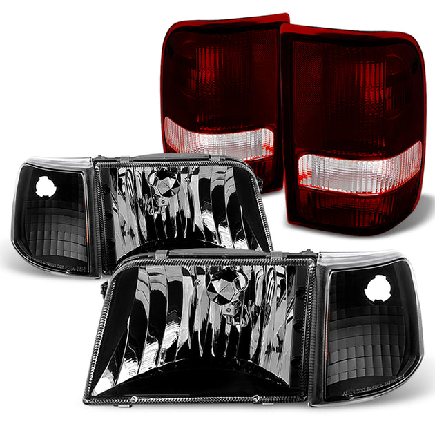 AKKON - For 1993-1997 Ford Ranger Black Headlights+ Black Corner Signal+ Dark Red Tail Lights Lamps