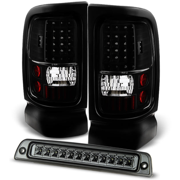 AKKON - For 1994-2001 Dodge Ram 1500 2500 3500 Black Tail Lights + LED 3rd Brake Light Lamp Combo