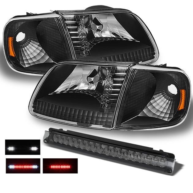 AKKON - For 1997-2003 Ford F150 | 2004 F-150 Heritage | 97-99 F250 Black Headlights + Corner Signal + Smoked LED 3Rd Brake Light