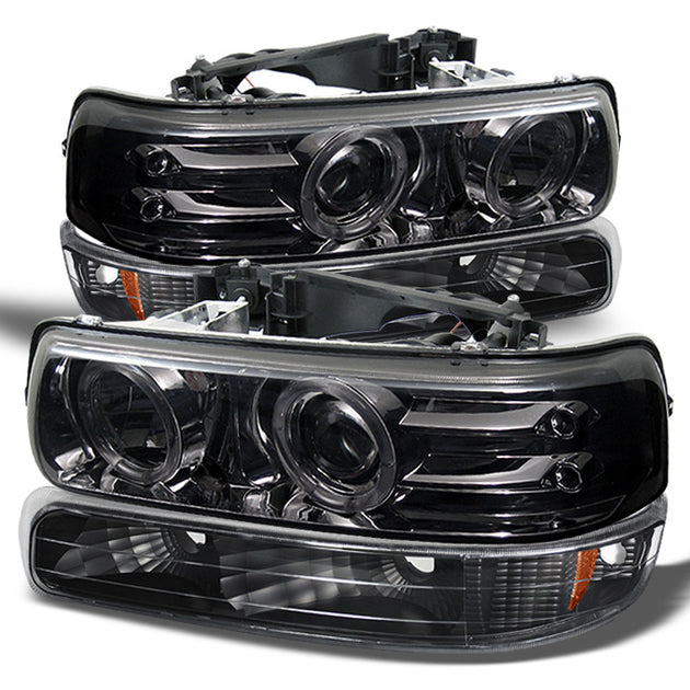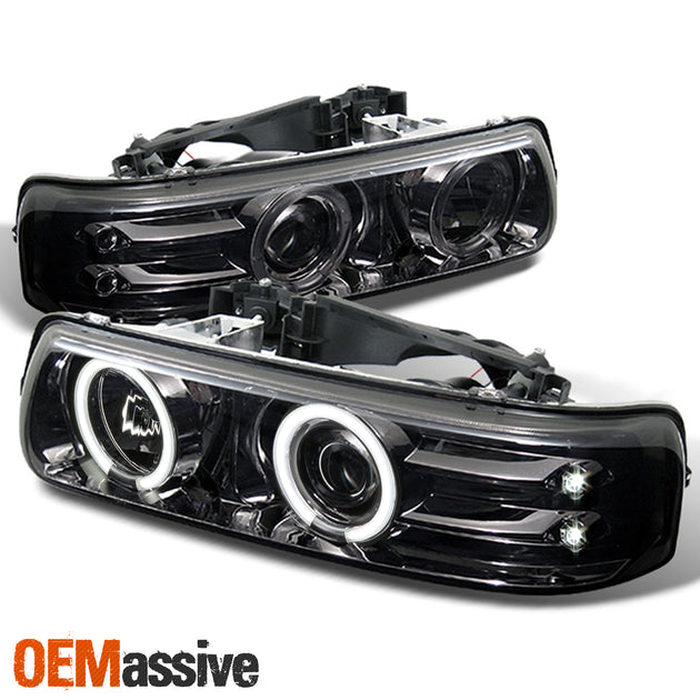AKKON - For 2000 Chevy Silverado Suburban Tahoe Smoked [Dual Halo] Projector LED Headlights+ Black Amber Bumper Turn Signal Lamp